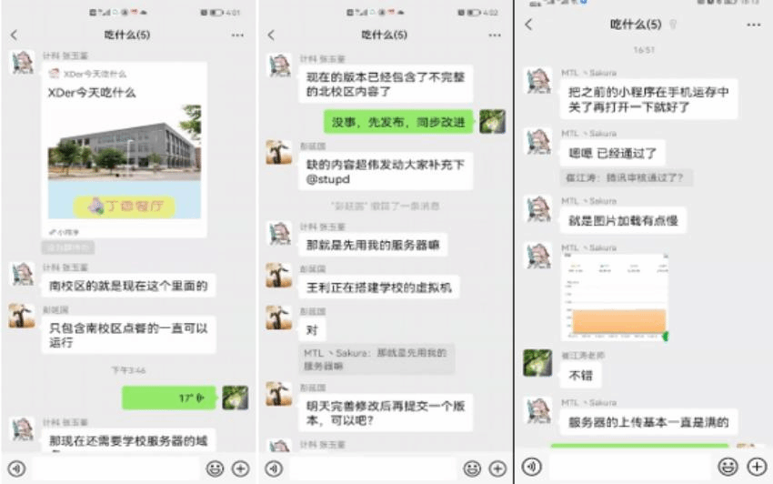 针对小程序运行之初,访问带宽受限、并行处理能力弱、小程序发布审核时间久等问题,必赢242net官网崔江涛教授、彭延国副教授带领研究生一起帮助张玉鉴加班加点提供解决方案,设计了支持高并发的部署方案,统筹协调计算中心开辟了专用虚拟服务器资源,争分夺秒完成了应用迁移,同时联系腾讯公司加速小程序审核,确保了“XDer今天吃什么”小程序及时发布。目前云选餐服务可以正常使用,后续将根据同学们的建议进一步完善相关功能。