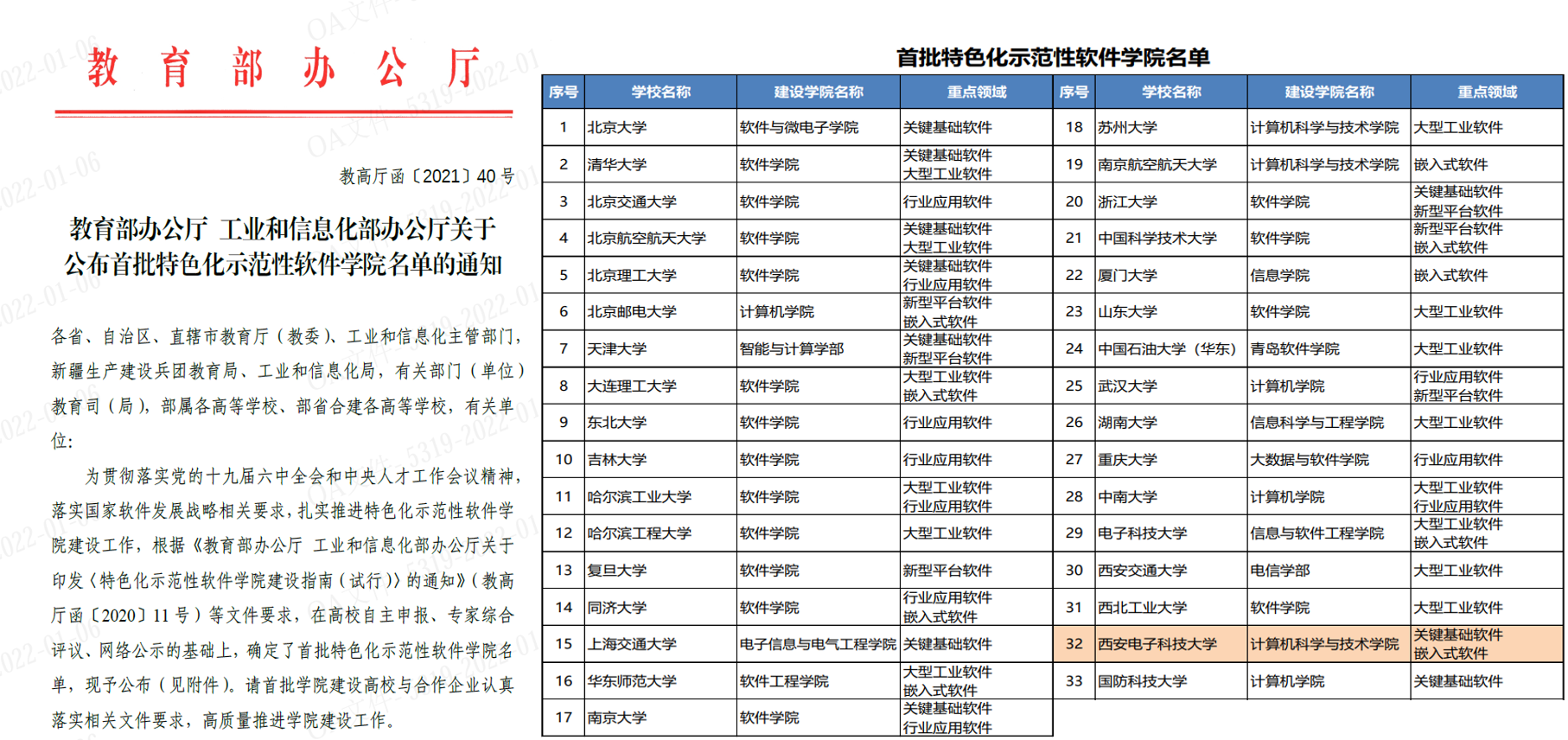2020年,必赢官网成立了以校领导为组长的特色化示范性软件学院建设领导小组,学院协同校内相关职能部门成立工作组开展建设和申报工作。工作组积极对接各重点领域头部企业,与华为技术有限公司、浪潮集团有限公司和统信软件技术有限公司等知名企业签署联合申报协议。学院以软件工程专业为基础,依托在关键基础软件、嵌入式软件等重点领域的科技创新成果和人才培养优势,与合作企业共同起草了特色化示范性软件学院建设方案和人才培养方案,顺利完成了特色化示范性软件学院的申报工作。教育部、工业和信息化部在高校自主申报、专家综合评议、网络公示基础上,确定了首批33所特色化示范性软件学院建设名单。