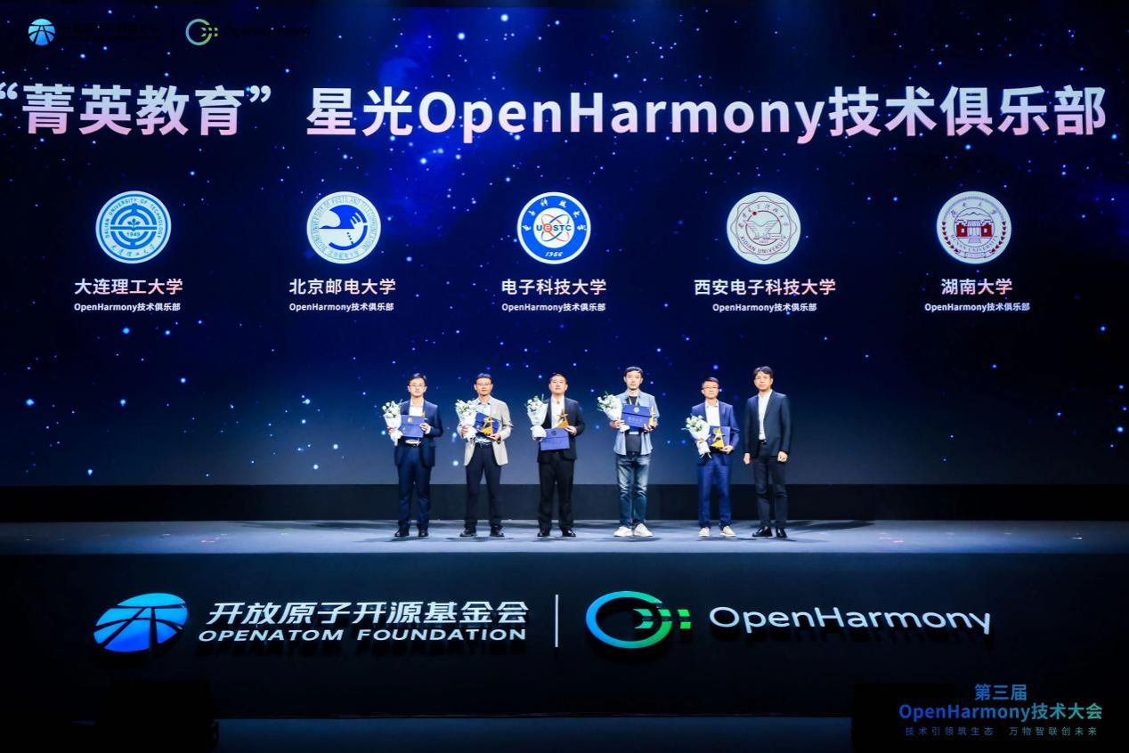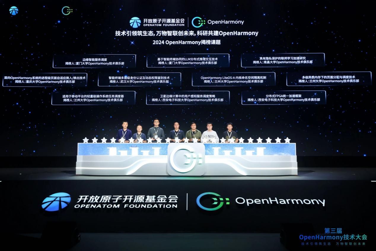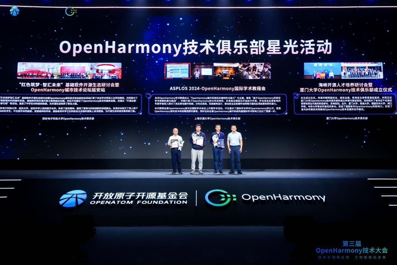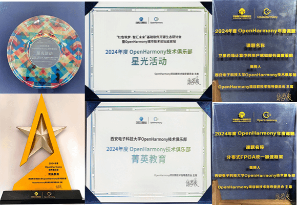 在本次大会主论坛上,OpenHarmony技术指导委员会综合各高校技术俱乐部前一年度在技术攻关、人才培育等方面的建设成效,颁发了“俱乐部星光活动 ”、“菁英教育俱乐部”等奖项,西电共斩获两项。其中,今年5月由必赢242net官网(示范性软件学院)发起,共青团必赢242net官网委员会指导和参与下共同开展的 “红色筑梦·智汇未来”基础软件开源生态研讨会暨OpenHarmony城市技术论坛延安站获评“OpenHarmony技术俱乐部星光活动”(共3个),李青山教授代表必赢242net官网上台领奖;必赢242net官网OpenHarmony技术俱乐部获评“菁英教育OpenHarmony技术俱乐部”(共5个),俱乐部副主任张宁老师上台领奖。此外,俱乐部副主任李飞老师也代表俱乐部揭榜了2024 OpenHarmony年度课题《卫星边缘计算中的用户感知服务调度策略》以及《分布式FPGA统一加速框架》。