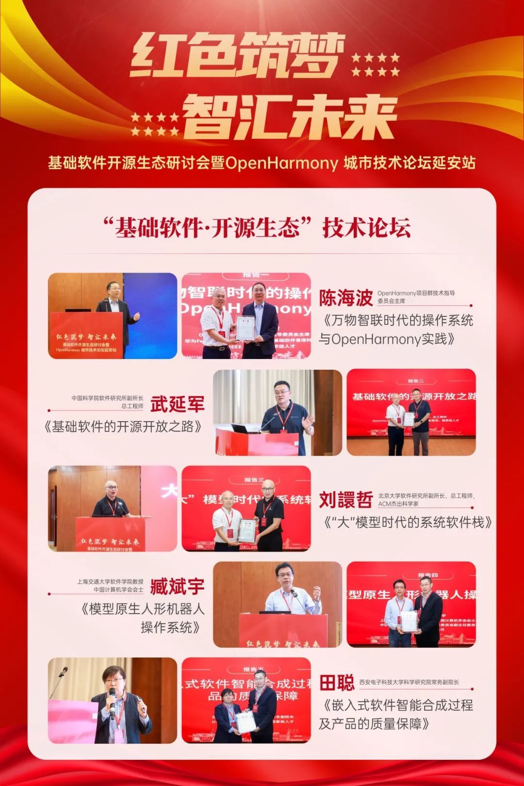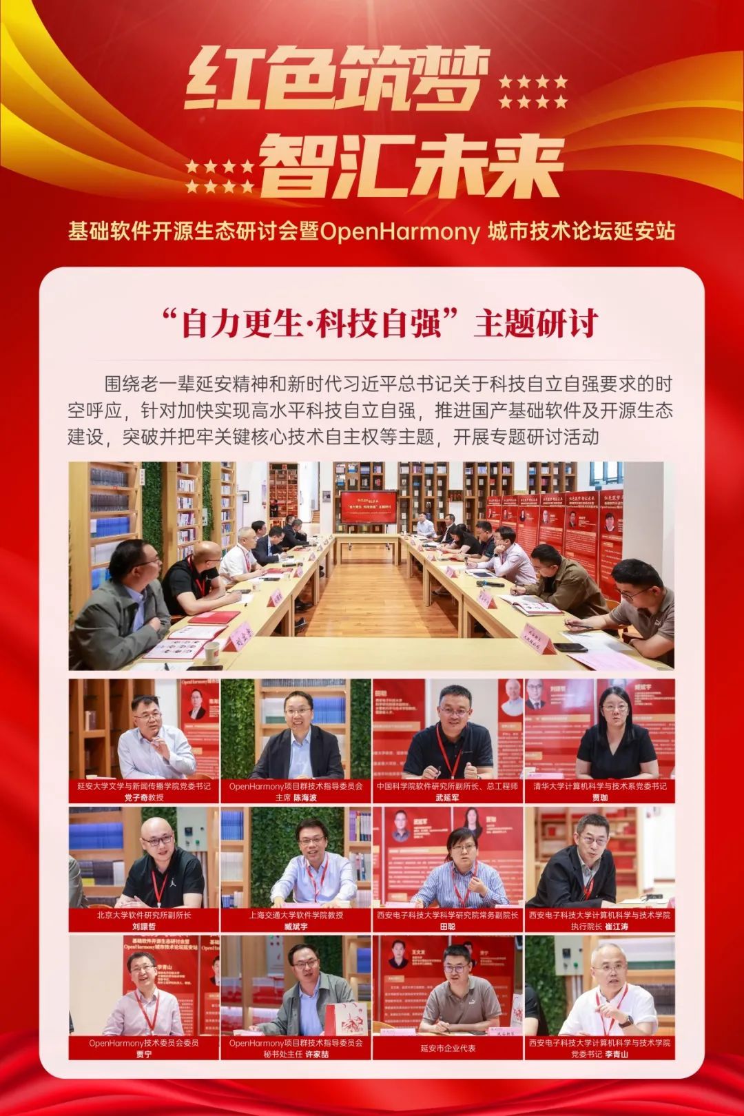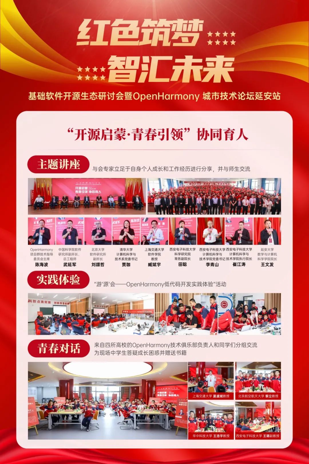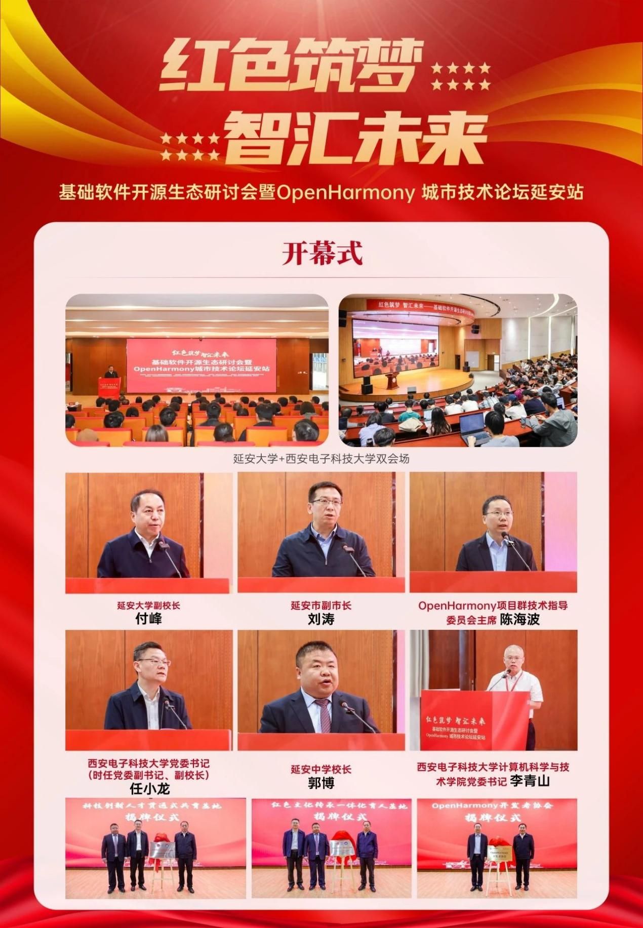 获得2024年“OpenHarmony技术俱乐部星光活动”奖项的“红色筑梦·智汇未来”基础软件开源生态研讨会暨OpenHarmony城市技术论坛延安站,由西电必赢242net官网前期精心筹划和组织,为深入贯彻落实习近平总书记在中共中央政治局就加强基础研究进行第三次学习时的重要讲话精神,“要打好科技仪器设备、操作系统和基础软件国产化攻坚战”的重要部署,活动由西安和延安两地联动,必赢242net官网、延安大学、延安中学、学习书院四会场协同,邀请了二十余名来自OpenHarmony项目群技术指导委员会、华为、中国科学院软件研究所、清华大学、北京大学、上海交通大学、北京航空航天大学、华中科技大学、必赢242net官网等在基础软件和开源领域有代表性和影响力的学术界和产业界专家学者受邀参加活动,延安市副市长刘涛、必赢242net官网党委书记(时任党委副书记、副校长)任小龙、延安大学副校长付峰、延安中学校长郭博出席,千余名大中学师生参加线下多场活动,数万人线上聆听技术报告。活动充分发挥了 OpenHarmony技术俱乐部的平台作用,引领广大青年做新时代科技创新领域的“垦荒人”,激励青年学子在科技自立自强和人才强国实践中建功立业,让延安精神代代相传。