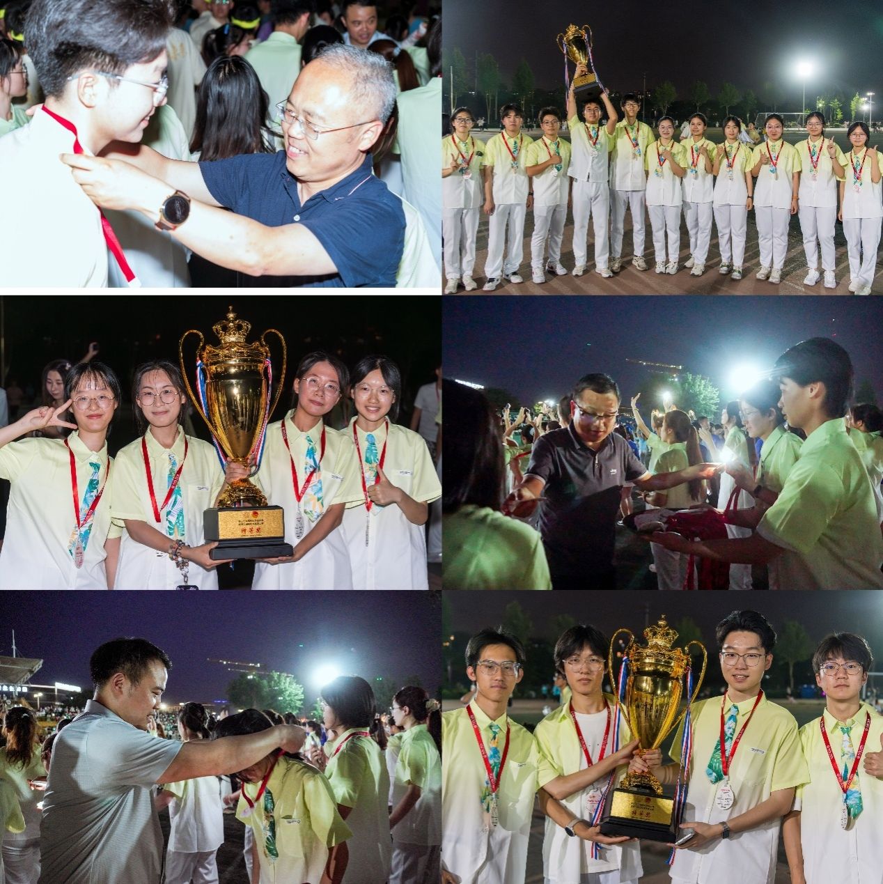 随着《本草纲目》动感旋律响起,150名计科学子如浪潮般涌入舞台,白绿交织的衣袂翻卷,恰似代码世界里跃动的光标,瞬间点燃全场气氛。音乐流转间,队列如数据流般快速重组,巨型表盘、数字城墙、科技烽火台、二进制时钟等富有学科特色的造型次第呈现,将科技理性与艺术感性熔铸成一场视觉盛宴。在“波浪式”队形变换过程中,计科学子整齐划一的蹲起动作是对西电红色电波的时代转译和继承传扬,刚健有力的挥臂姿态更是对 “挺膺担当” 青春誓言最生动的诠释与呼应。当音乐达到高潮,队员们齐声高呼“嘿!”,以蓬勃向上的姿态展示定格动作,掌声与喝彩声不绝于耳。比赛尾声,学院领导亲自为所有参赛同学逐一颁发奖牌及证书,并与同学们合影留念,将这份荣誉与喜悦永久珍藏。