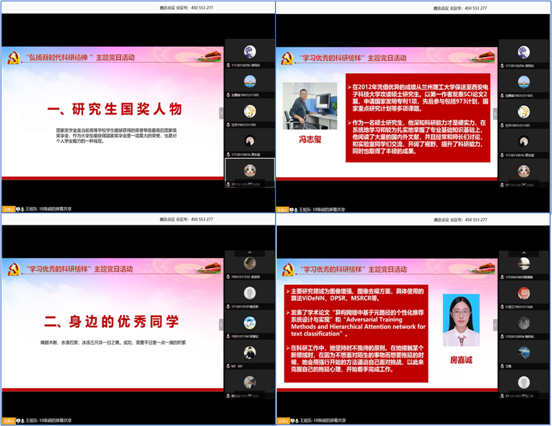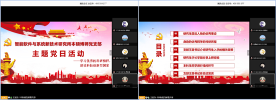 (通讯员 赵海洋)为激发本科生党员的科研热情,学习优秀研究生的科研精神和学习态度,积极响应把我国建设成为创新型国家和世界科技强国而努力奋斗的号召,计科院智能软件与系统新技术研究所本硕博师联合党支部与辅导员张志为老师共同策划,于2020年4月24日组织召开了“学习优秀科研榜样,建设科技创新型国家”主题党日活动。本次活动由支部青年委员王旭东同志主持,活动共计120人参加,包括32名支部党员,88名17级本科生及入党积极分子。