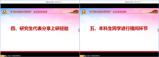 活动开始,青年委员王旭东首先为大家介绍了一些取得了优异成果的优秀研究生榜样及支部内的优秀党员榜样,带领大家学习他们的科研心得和精神,并表示学生党员更应该在学习科研中发挥带头作用,不忘初心,持之以恒,做好科研,做出表率,为建设科技创新型国家而努力。