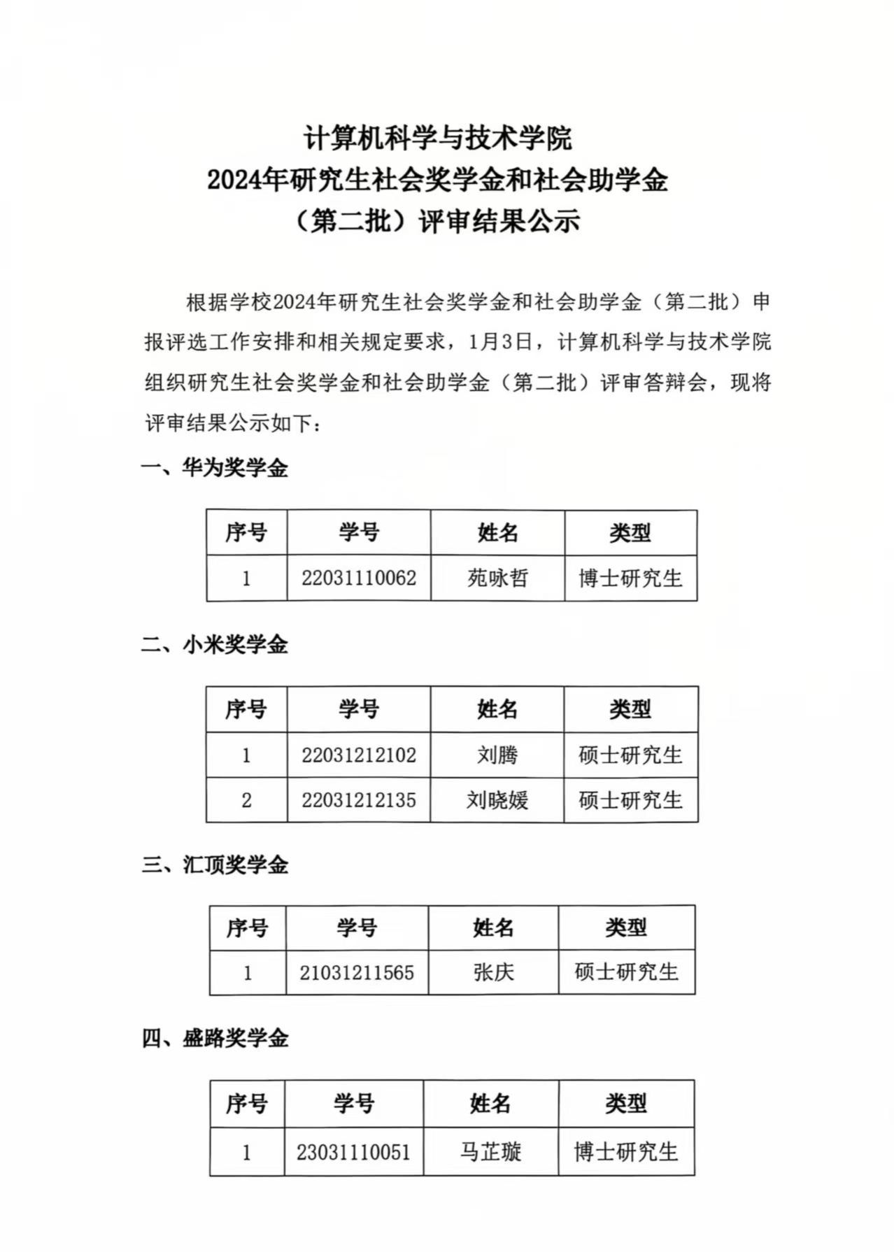 必赢242net官网2024年研究生社会奖学金和社会助学金(第二批)评审结果公示