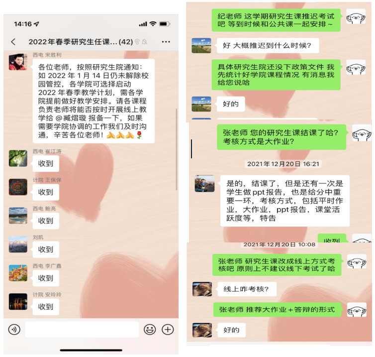 二、积极应对,确保研究生教育教学工作质量。临近期末,为了将疫情对于教育教学的影响降至最低,学院积极联系研究生课程任课教师开展线上教学,通过线上辅导、电话答疑以及网络讨论等多种形式保证研究生课程教学和日常指导有序进行,同时,安排办公室管理人员紧急摸排本学期课程进展及考试组织情况,对于未考试的课程,采用灵活方式组织以大作业或线上报告等形式进行考核,并督促任课教师按照进度要求批改试卷,及时上传考试成绩。此外,为了应对疫情新的发展态势,学院及时组织承担2022年春季学期课程教学任务的老师做好提前授课的准备,着手准备上课所需相关资料或线上教学环境,稳步推进研究生教育教学各项工作。
