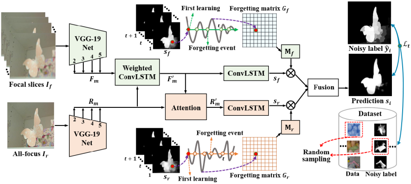 冯明涛博士长期从事复杂场景视觉感知与理解领域相关的研究工作,在学院良好科研环境支持下,所做系列工作相继发表在IEEE TIP、PR、ICCV等期刊会议,并入选2021年青年托举人才,是论文“基于像素级噪声标签的学习策略:一个光场显著性检测的新视角”(“Learning from Pixel-Level Noisy Label : A New Perspective for Light Field Saliency Detection”)的第一作者,张亮教授是该论文的通讯作者,合作者有湖南大学王耀南教授、澳大利亚西澳大学Ajmal Mian教授等,必赢242net官网是该论文的第一完成单位及通讯作者单位。该论文受人类学习过程中“学习-遗忘-再学习”的机制所启发,解析了不确定标签监督下深度网络模型训练过程中的遗忘规律,抑制不确定标签对深度网络模型训练的干扰,进而大幅度提升深度网络模型的鲁棒性和稳定性。