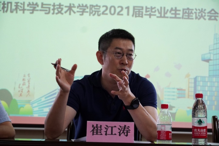 计算机科学与技术专业本科毕业生党奇伟同学讲述其参加了全国大学生党史知识竞赛的经历,对学院在党史学习教育上的培养表示感谢,并提出了党史学习实践方面的意见建议。物联网工程专业本科毕业生文悦力同学则希望对学校精品课程进行更好的保存,以方便同学们进行自主的学习。计算机科学与技术专业本科毕业生张金涛同学指出本科阶段,很少有看论文发论文的机会,希望学院能进一步加大本科生科研的力度。计算机科学与技术专业毕业班班长常家俊同学希望在大一阶段,学院可以增加对培养方案整体架构的讲解,让同学们知道课程的先后铺垫关系。计算机科学与技术教改班本科毕业生朱俊锟同学指出课程设置中,有些课的关系被强行割裂开,使得同学们对课程的学习效果不是很好,建议学院课程设置予以改进。