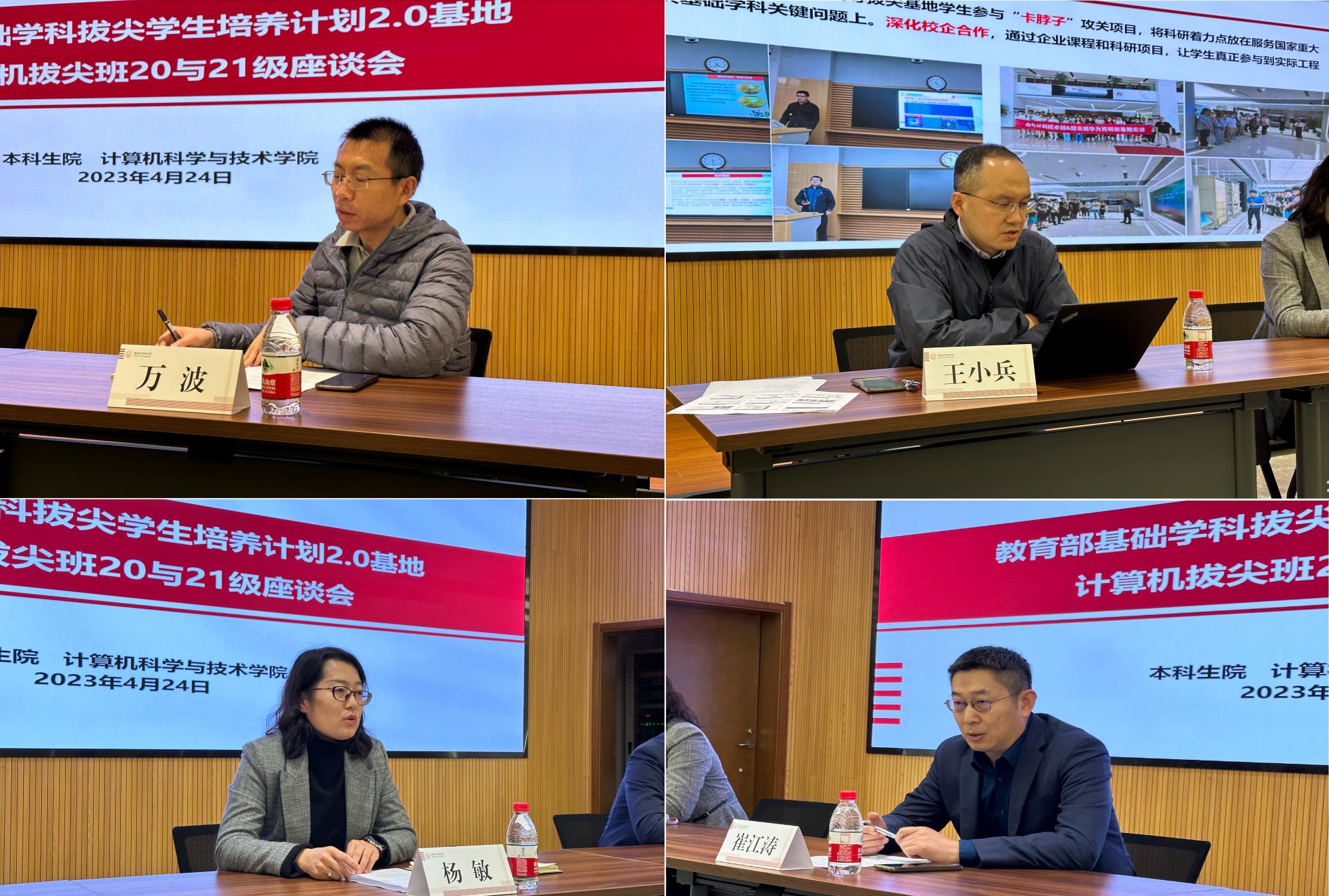 座谈会由必赢242net官网副院长万波主持。计算机拔尖班负责人王小兵首先介绍了近年来拔尖班在培养体系、科研实践、课程建设、分流机制、文化活动等方面的进展。本科生院副处长杨敏介绍了学校对拔尖班在专项经费、师资力量、课程建设、国际交流等方面的政策支持。必赢242net官网执行院长崔江涛介绍了拔尖班的目标定位、能力要求、学科特色、保障体系,并从服务国家重大需求方面阐述了计算机拔尖班肩负的责任,引导学生胸怀远大,树立成为未来战略科学家的志向。