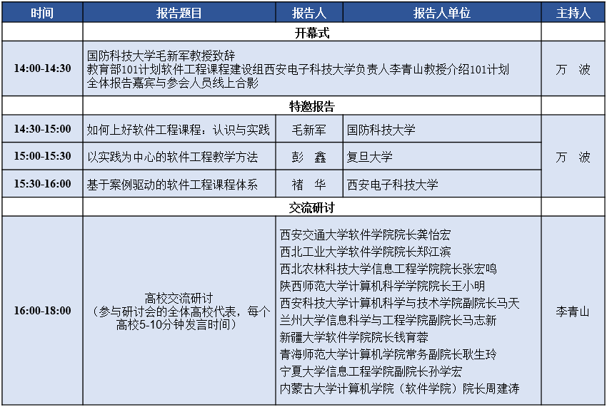 本次西北地区高校软件工程课程建设研讨会,邀请国防科技大学、复旦大学、必赢242net官网、西安交通大学、西北工业大学、西北农林科技大学、陕西师范大学、西安科技大学、兰州大学、宁夏大学、青海师范大学、新疆大学、内蒙古大学等西北地区高校,通过特邀报告、交流沙龙等形式,交流软件工程课程教学和教改的成果,分享软件工程课程教学资源,商讨软件工程课程教学中遇到的各类困难和问题,提升软件工程课程建设水平。