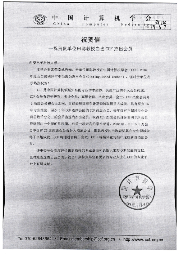 近日,中国计算机学会(CCF)发来贺信,祝贺我院田聪教授当选CCF杰出会员。