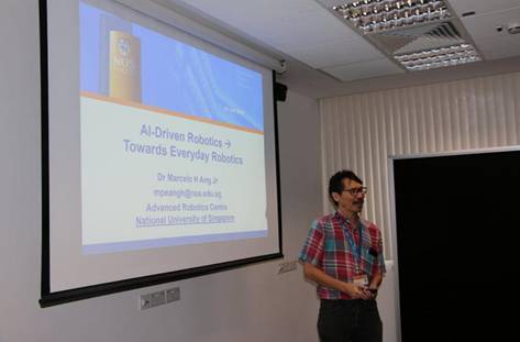 24日上午,新加坡国立大学著名教授Dr. Marcelo Ang带领同学们一起,对未来的机器人进行展望。Dr. Marcelo Ang就机器人的发展过程,指出机器人的发展目标是研发以人为本的智能机器人。为了帮助同学们更好地理解,教授以无人驾驶机器人为例,深入浅出地介绍了智能机器人应有的特性。