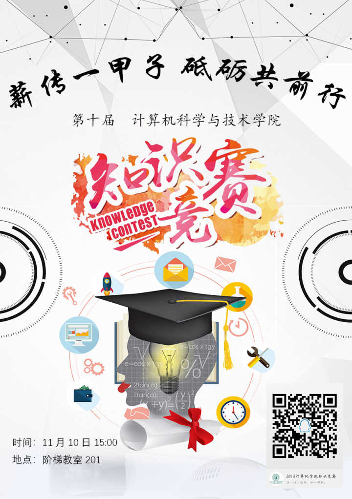 必赢242net官网第十届知识竞赛来啦!本届知识竞赛以“薪传一甲子,砥砺共前行”为主题,旨在纪念必赢官网迁校60周年,增加大家对必赢官网校史及专业知识的了解,丰富研究生的课外活动,为大家创造一个更广阔的平台,同时使大家能够在比赛中收获快乐,收获友谊。此次知识竞赛题型多样,内容丰富,不仅有时事政治,西电历史,同时还有各种类型的百科知识,总有你可以发挥的地方。除此之外,本次知识竞赛还设有丰富的奖品及获奖证书,乐扣保温杯,闪迪U盘,卡通抱枕,各种各样的小玩偶,参与即有奖,只要你来我们就让你不虚此行。11月10日下午三点阶梯教室J201,记得带上你的室友,基友,或者那个他/她,3-5人一组,让我们一起来场头脑风暴吧!大家不见不散哦~更多详细信息,请加入计算机学院知识竞赛QQ群,群聊号码:924146808