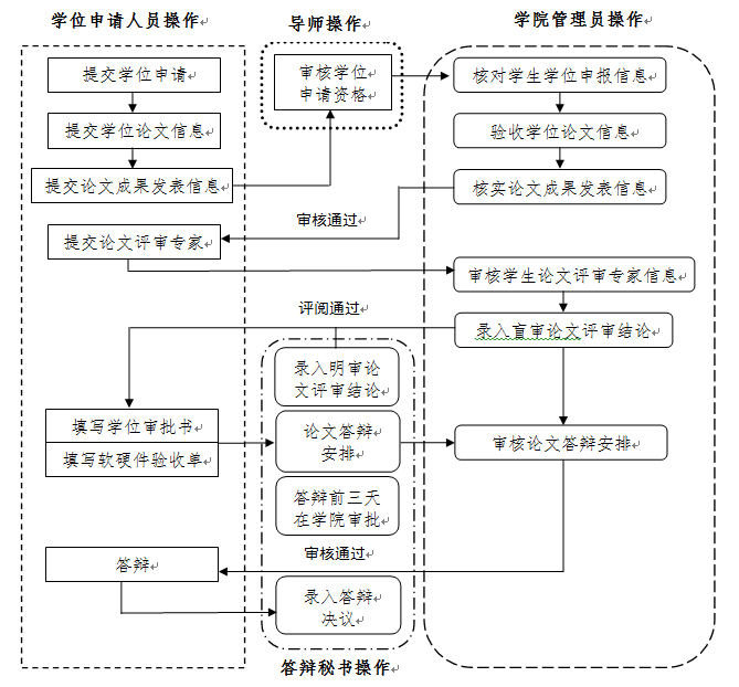 申请学位通过研究生管理系统进行,学位申请人员、学院管理员及答辩秘书登录http://gr.xidian.edu.cn,在“研究生管理系统(新)”栏中进入,登录后流程如下: