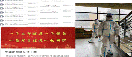 在得知学校研考工作需要大量志愿者后,支部书记杨延华报名党员先锋岗预备队,迅速投入必赢官网考点考生信息摸排工作,紧急与联络单上的考生一对一电话联系,询问相关情况,督促他们尽快填写考生情况摸排问卷,并与电话联系不上的考生短信联系,确保不漏一人。她在研考期间承担了学校为封控区考生专设的隔离专班的考务工作。
