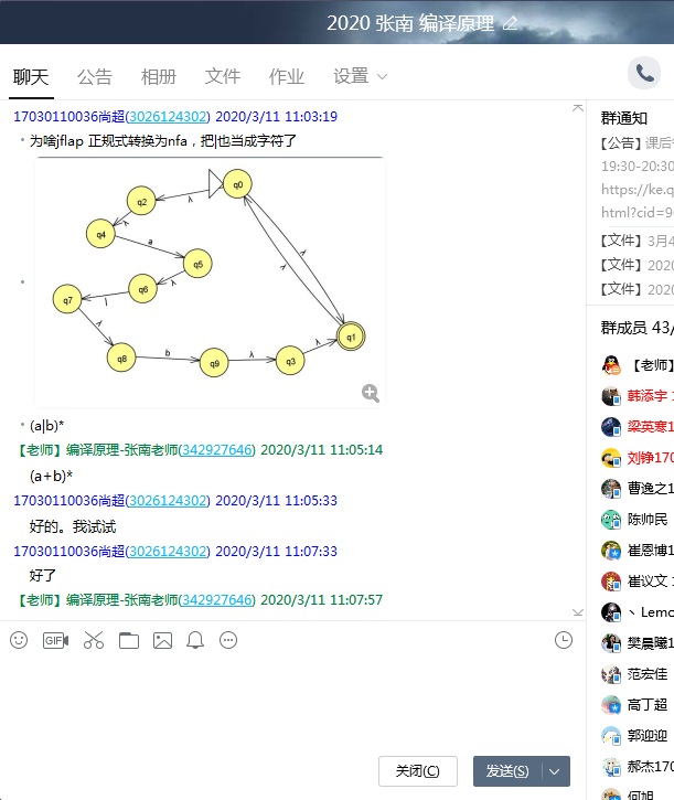 “编译原理”线上教学的第一堂课是由三位老师分别单独授课,整体运行平稳有序。但是三位老师课后回顾授课各个环节和细节,也从中总结发现了一些问题: