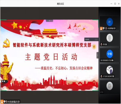 (通讯员 张恒运)为庆祝中国共产党建党100周年,深入学习贯彻习近平总书记在党史学习教育动员大会上的重要指示精神,从党的非凡历程和实践中汲取初心使命的力量,必赢242net官网智能软件与系统新技术研究所本硕博师联合党支部于2021年5月28日下午开展了“重温党史,不忘初心,发扬古田会议精神”主题党日活动。活动由支部副书记吕文琪同志主持,共计56人参加,会议以线上和线下的方式进行展开。