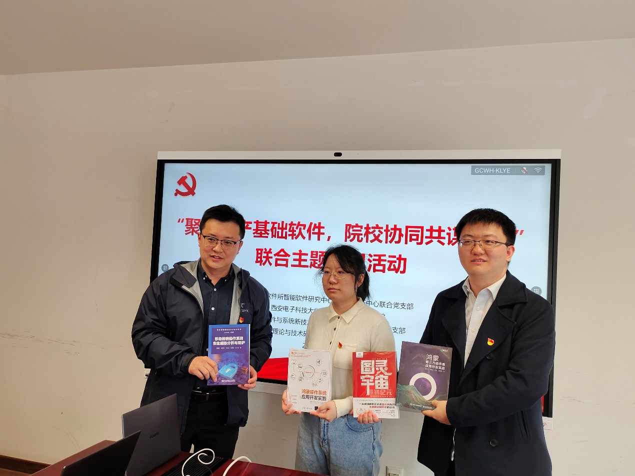 在赠书环节,中科院软件所向西电计科院赠送了支部成员参与编写并出版的《图灵宇宙:原初纪元》、《鸿蒙操作系统应用开发实践》等专业书籍。