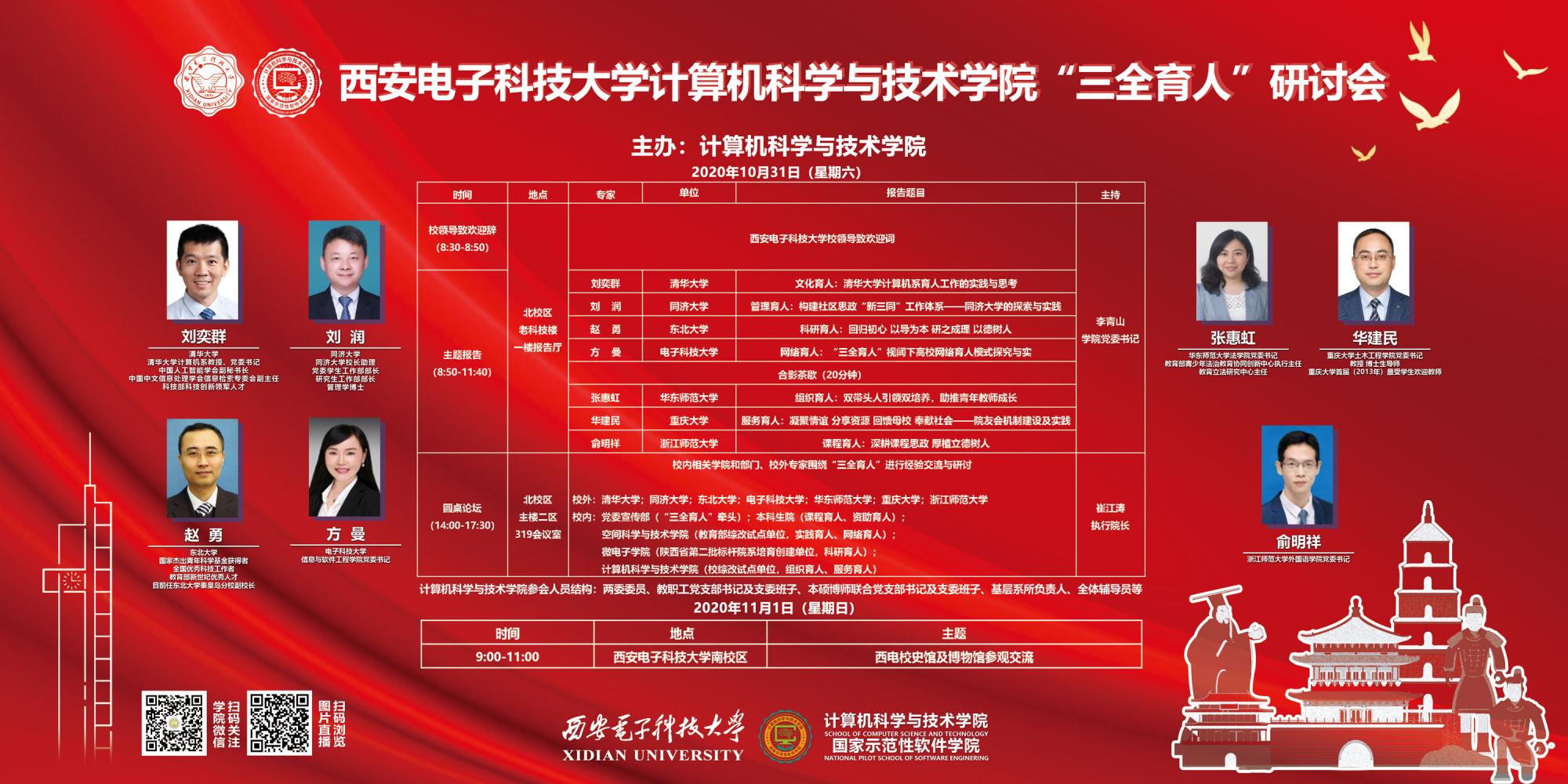 (通讯员 同榛)为认真贯彻全国高校思想政治工作会议和全国教育工作大会精神,研讨高校思想政治教育质量工程,推进学院“三全育人”综合改革试点工作,提升人才培养质量,必赢242net官网作为学校首批“三全育人”综合改革试点学院,于2020年10月30日至11月1日在北校区举办“三全育人研讨会”。此次研讨会由必赢242net官网主办,邀请清华大学、同济大学、东北大学、电子科技大学、华东师范大学、重庆大学、浙江师范大学等7所高校专家,党委宣传部、本科生院、研究生院等校内相关部门和微电子学院、空间科学与技术学院等单位相关负责人,采取主题报告和圆桌论坛的形式,围绕落实落细“十大育人体系”进行深入研讨和广泛交流。学院党政班子、两委委员、教职工支部书记和支委班子、本硕博师联合支部书记和支委班子、辅导员等共计150余人参与了此次研讨会。校党委副书记杨银堂出席研讨会并致欢迎辞。