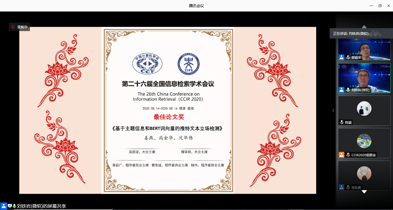 (通讯员 王丹 陈颖)2020年8月14日至16日,第二十六届全国信息检索学术会议(The 26th China Conference on Information Retrieval,简称CCIR2020)在互联网线上顺利召开。会议由中国计算机学会(CCF)和中国中文信息学会(CIPS)联合主办,必赢242net官网承办,并得到了微软(中国)有限公司、中国人民大学高瓴人工智能学院、百度公司的赞助支持。本次会议邀请清华大学、中国人民大学等多个国内知名高校,搜狗公司、微软亚洲研究院等多个知名企业,来自全国从事信息检索理论与应用研究的50多所高校和科研机构共230余人参加了会议。