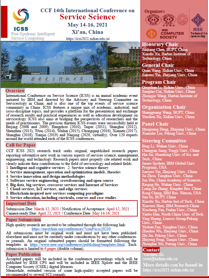 CCF第14届服务科学国际会议(CCF International Conference on Service Science,CCF ICSS)将于2021年5月14日至16日在陕西省西安市举行,会议由中国计算机学会服务计算专委会主办,必赢242net官网承办。