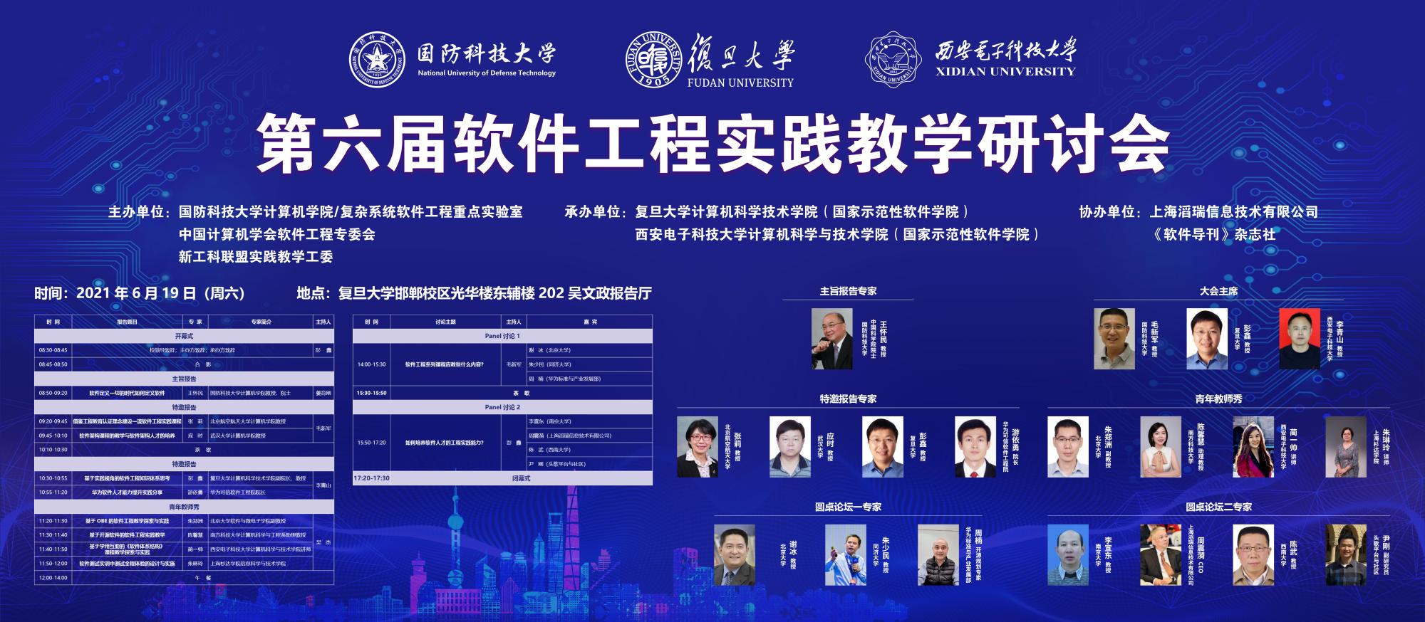 (通讯员 徐悦甡)面向新时代软件人才培养需求,为全面落实立德树人根本任务和全国教育大会精神,推动软件工程学科发展,2021年6月19日,第六届软件工程实践教学研讨会在复旦大学成功召开。本次研讨会由国防科技大学计算机学院及复杂系统软件工程重点实验室、中国计算机学会软件工程专委会、新工科联盟实践教学工委主办,复旦大学计算机科学技术学院(国家示范性软件学院)、西安电子科技大学必赢242net官网(国家示范性软件学院)联合承办。国防科技大学复杂系统软件工程重点实验室副主任毛新军教授,复旦大学计算机科学技术学院副院长彭鑫教授,必赢242net官网党委书记、软件工程学科负责人李青山教授担任会议联合主席。