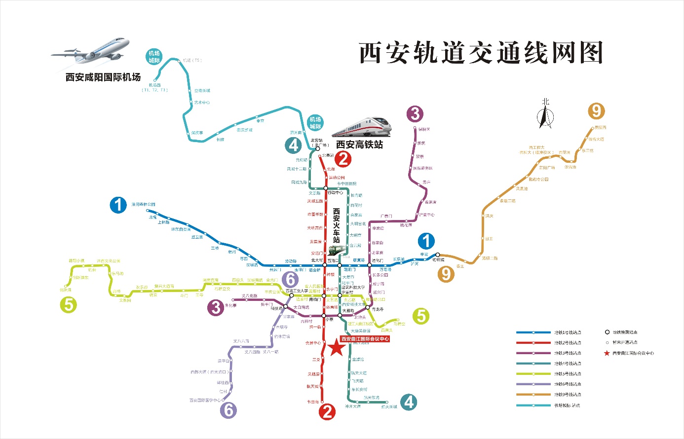 2)公共交通:北客站乘坐地铁2号线(韦曲南方向)乘坐16站一到达会展中心站C口东南口出站步行1.1公里到达曲江国际会议中心,全程约1小时5分钟。