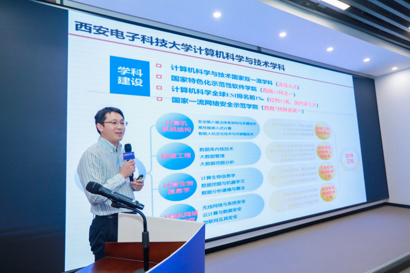 随后,沈玉龙教授与参会企业共同分享了《计算机技术前沿发展趋势》主题报告,并进行了开放应用场景的“揭榜挂帅”,从计算机科学与技术和软件工程两大学科,详细讲解了西电必赢242net官网科学研究内容和技术应用场景。