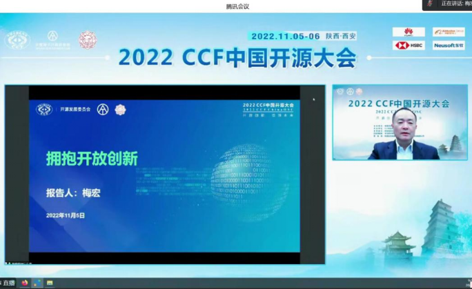 CCF理事长梅宏院士代表中国计算机学会对大会的召开表示热烈祝贺。梅宏院士指出,软件是数字化转型的核心,软件发展离不开开源,首届CCF开源大会的召开对于我国开源生态的发展具有重要意义,为此中国计算机学会有责任推动中国乃至国际开源事业的发展。梅宏院士希望本次大会可以启发开源发展新思想,促进开源领域新合作,并预祝大会取得圆满成功。
