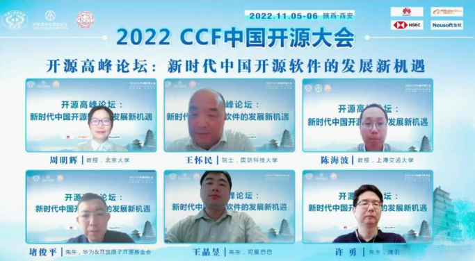 以“新时代中国开源软件的发展新机遇”为主题的开源高峰论坛由开源发展委员会副主任、北京大学教授周明辉主持,王怀民院士、上海交通大学陈海波教授、开放原子开源基金会TOC主席堵俊平、阿里巴巴开源办公室负责人王晶昱、腾讯开源办公室执行总监许勇作为嘉宾围绕着论坛给出的三个问题分享了自己的观点。