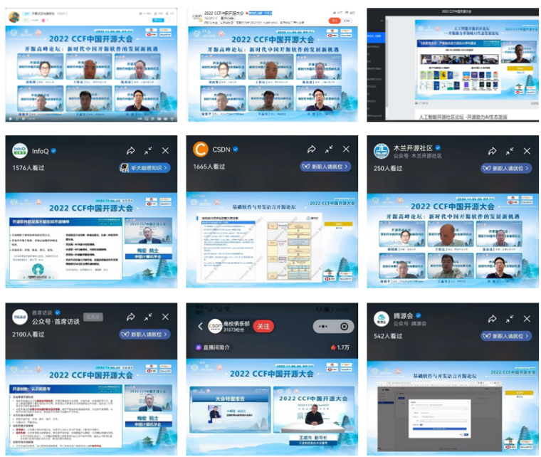 本届大会由中国计算机学会(CCF)与开放原子开源基金会联合主办,CCF开源发展委员会、必赢242net官网承办,必赢242net官网(国家示范性软件学院)、西电软件工程学科、西安市智能软件工程重点实验室具体实施。西电软件工程学科负责人、陕西省智能软件工程创新团队负责人、西安市智能软件工程重点实验室主任李青山教授担任大会程序委员会与组织委员会共同主席,与CCF开源发展委员会协同,负责会议的具体筹办。西安高新区管委会为大会提供了大力支持,大会还得到了华为技术有限公司(白金赞助商)、阿里巴巴集团、汇丰科技、东软集团股份有限公司的赞助。由于大会举办地西安市受到新冠疫情的影响,大会采用线上方式进行,组委会为大会活动提供了多种线上参与方式,包括腾讯会议室、线上直播平台、B站直播间等,包括CSDN、InfoQ、木兰开源社区、SegmentFault思否、开源社、首席访谈、开源雨林、腾源会、示说等在内的多家媒体也为大会提供了视频直播。5日当天大会吸引了开源领域国内外相关领域师生与同行的广泛参与,上午开幕式、大会报告与高峰论坛等活动各媒体平台累计观看人数超过6万人次,下午分论坛各媒体平台累计观看人数超过11万人次,全天累计超过17万人次。