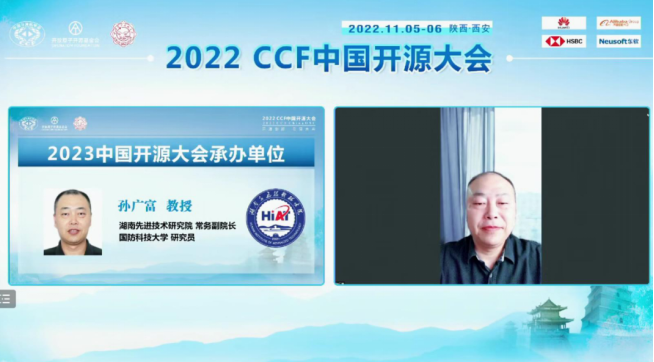 随后,大会举办了下届会议的承办交接仪式,第二届CCF中国开源大会将由湖南先进技术研究院承办,常务副院长孙广富教授代表承办单位参加交接仪式,对湖南先进技术研究院进行了介绍,并表示感谢开源发展委员会的信任,会向本届大会承办单位取经,同时会与开源发展委员会密切协同,力争为开源领域的广大师生同行再次呈现一次精彩的大会。