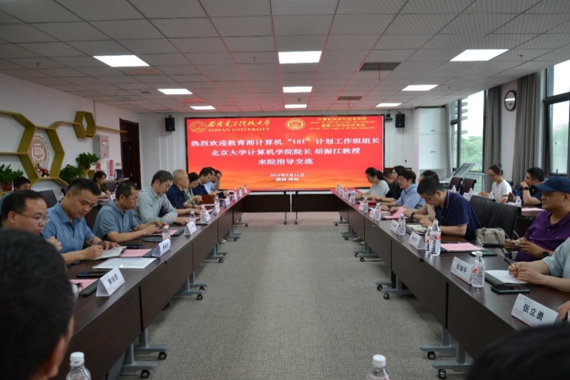 学院执行院长崔江涛从历史沿革、学科建设、师资队伍、人才培养、科学研究等方面对学院的建设发展情况进行了介绍;教学副院长万波介绍了学院参与 “101计划”工作情况和取得的建设成效;万波、褚华、李辉作为《程序设计基础》、《软件工程》和《数据库系统》三门核心课程的负责人,对课程建设情况进行了汇报。胡振江教授认真听取了汇报,肯定了学院的发展和课程体系建设成效,表示西电必赢242net官网的人才培养很有特色,希望将来加强北大计算机学院与西电计科院的交流学习。